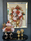 3 boyutlu çiçek dokusu, altın tonlu yapraklar ve metal vazodaki uyum sayesinde mekâna sofistike bir hava katıyor. El işçiliğiyle hazırlanan tablo, hem modern hem klasik dekorasyonlarla kolayca uyum sağlar.