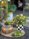 Modern çizgilerle doğal dokuyu buluşturan bu özel set, damalı saksı içerisinde yerleştirilmiş yapay sukulent aranjmanı ve altın tonlu kabak obje ile tamamlanıyor. Siyah-beyaz dama desenli saksı ve kabak üzerindeki aynı desene sahip fiyonk, setin tasarım bütünlüğünü vurgular.