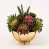 Gold görünümlü, armalı vazo içinde sunulan bu yapay sukulent aranjmanı; farklı dokularda bitkiler, mini kabak ve kozalak detaylarıyla sonbahar temalı sıcak bir atmosfer yaratır. Dekoratif kullanım için ideal ve bakımı zahmetsizdir.