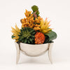 Gümüş görünümlü, fildişi vazo içinde sunulan bu yapay sukulent aranjmanı; farklı dokularda bitkiler, mini kabak ve kozalak detaylarıyla sonbahar temalı sıcak bir atmosfer yaratır. Dekoratif kullanım için ideal ve bakımı zahmetsizdir.