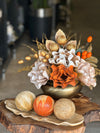 Altın tonlarında parlak metal vazoda sunulan sabit aranjman; turuncu, krem, bakır ve kiremit tonlarında saten çiçekler, yapraklar ve meyve formlu detaylarla zenginleştirilmiştir.